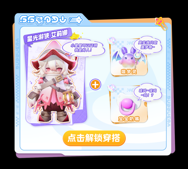 星光游俠 艾莉娜+噬夢(mèng)靈+寶寶奶嘴=美夢(mèng)仙子星光游俠 艾莉娜:小星星可以證明我是好人!噬夢(mèng)靈:其實(shí)我只吃噩夢(mèng)哦~寶寶奶嘴:哇嗚~哇嗚~嗚???