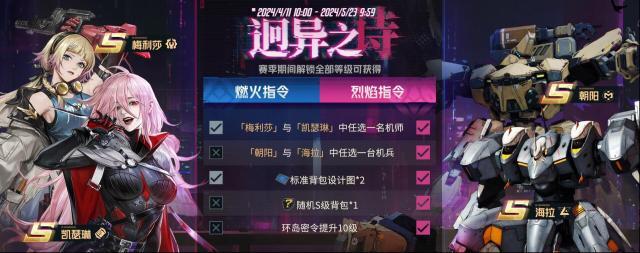 ▲激活燃火指令和烈焰指令可獲得的核心機(jī)師/機(jī)兵獎勵輪換為:機(jī)師自選(梅麗莎與凱瑟琳中任選一名機(jī)師)、機(jī)兵自選(朝陽與海拉中任選一臺機(jī)兵)。