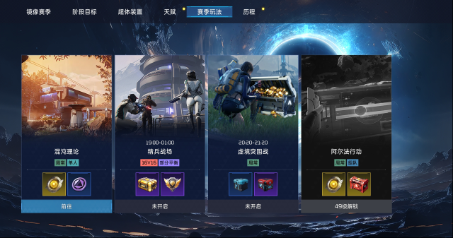 每個(gè)賽季都會開放對應(yīng)的賽季玩法,通過賽季玩法幸存者們可以獲得更多的賽季等級經(jīng)驗(yàn)?!哥R像賽季」的玩法為阿爾法行動(dòng)、混沌理論、迪基塔聯(lián)賽。