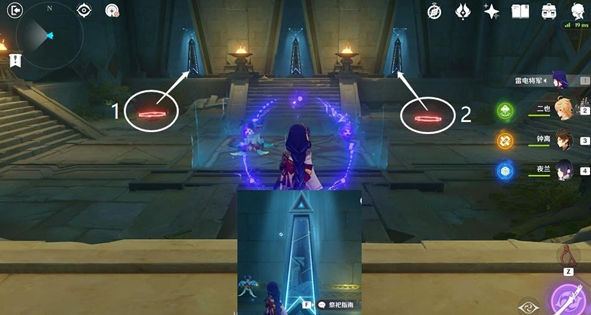 打開開關(guān)1號(hào),旋轉(zhuǎn)對(duì)應(yīng)的方碑到圖中圖案并且發(fā)光,之后關(guān)閉開關(guān)1,打開開關(guān)2,也是旋轉(zhuǎn)對(duì)應(yīng)方碑到圖中圖案并且發(fā)光,等待中間石碑自動(dòng)旋轉(zhuǎn)并發(fā)光。